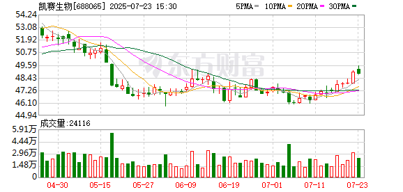 证券时报·数据宝统计显示,凯赛生物今日收盘价为48.75元,下跌0.43%,日换手率为0.41%,成交额为1.18亿元,全天主力资金净流入31.74万元,近5日该股累计上涨3.39%,近5日资金合计净流出1506.33万元。